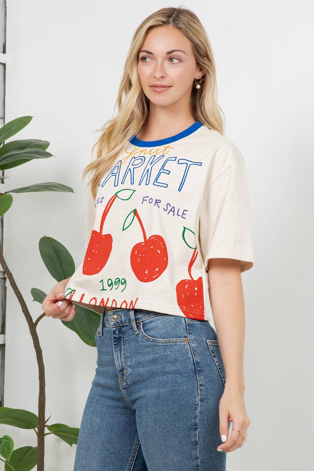 Turn heads in this cute cherry market print cotton crop top. The trendy design captures the charm of a bustling farmers market with vibrant, playful details. Made from soft cotton, it's breathable and comfortable for everyday styling. Layer it or wear it solo for an effortless look that showcases your fun, fashion-forward taste and love of whimsical prints.